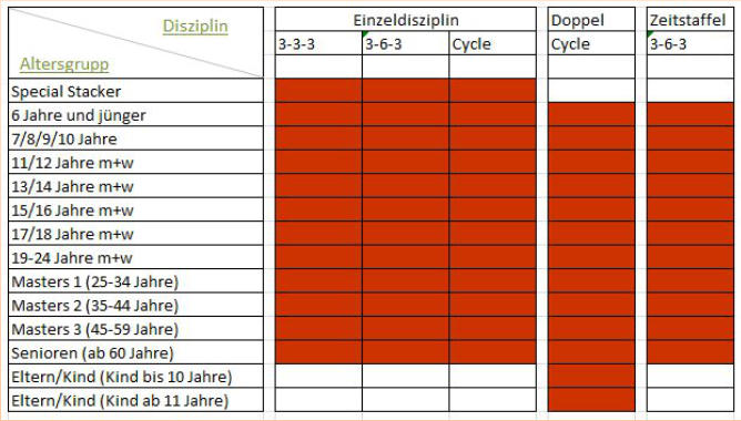 Die Zuteilung zu einer Altersklasse richtet sich nach dem Geburtstag des Teilnehmers. Doppel- und Staffelzuteilung richten sich nach dem Geburtstag des ältesten Teilnehmers. Erwachsene und Kinder dürfen nicht in einer Staffel starten. Alle Teilnehmer über 18 Jahre können altersklassenübergreifend (Collegiate + Masters 1; Master 2 + Senioren) eine Staffel für eine der Opern-Klassen bilden.Im Doppel der Erwachsenen zählt das Alter des jüngeren Stackers für die Zuordnung zu einer Altersklasse. Erwachsene und Jugendliche können im Doppel gemeinsam in der neuen offenen Doppel-Altersklasse starten.***Änderungen je nach Teilnehmerzahl möglich. Wir behalten uns das Recht vor, je nach Bedarf einzelne Altersklassen zusammenzufassen oder zu teilen.