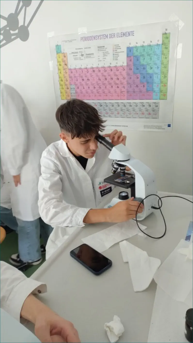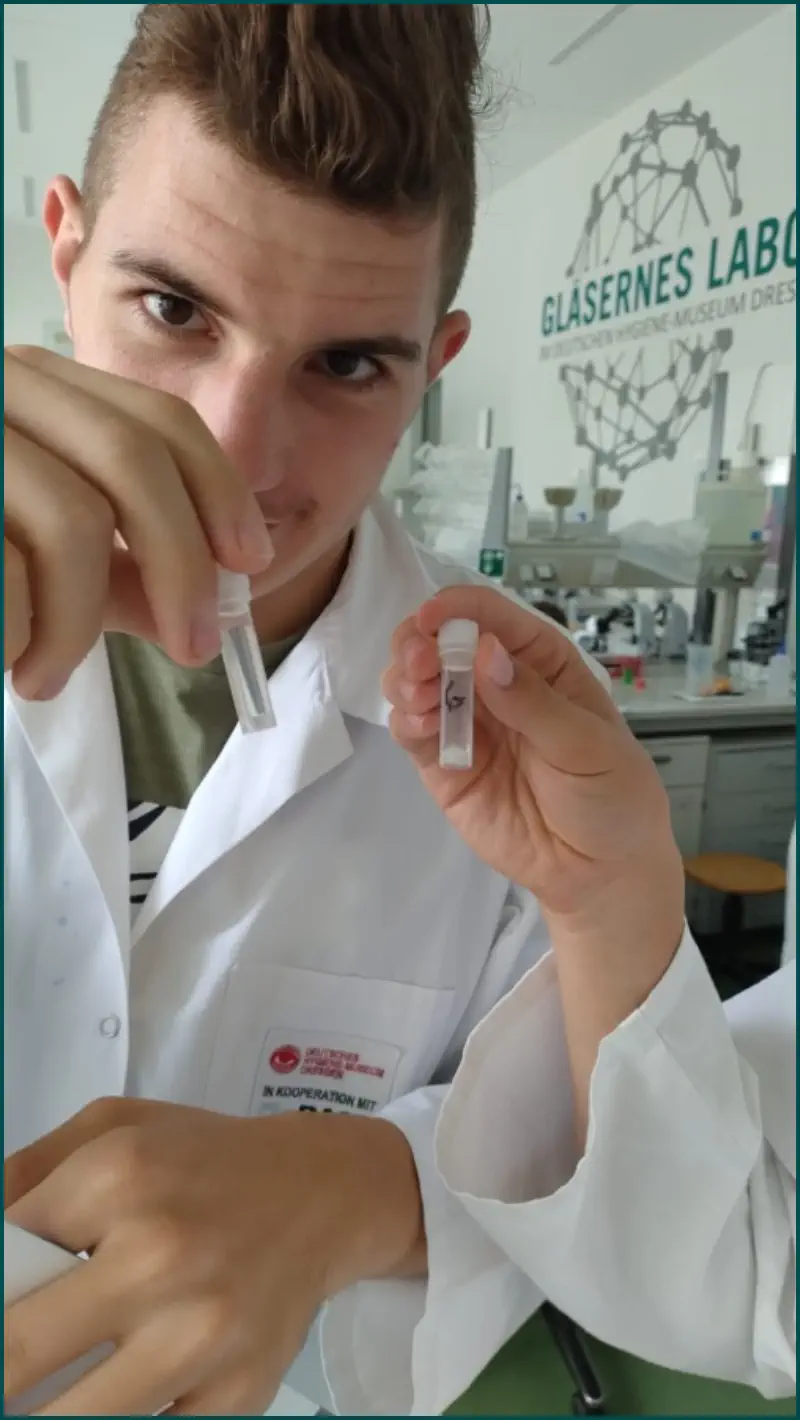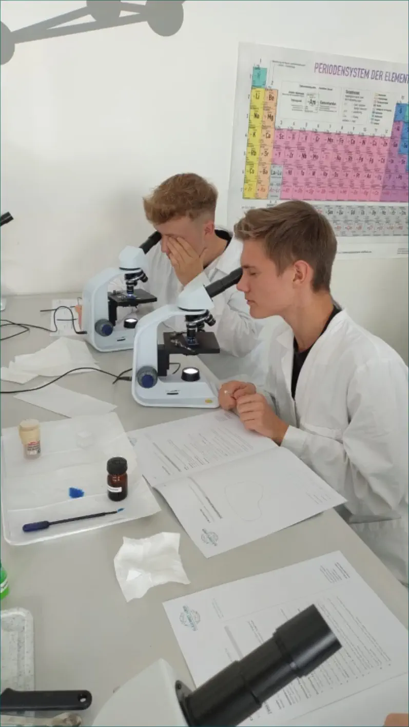 Vor den Herbstferien fahren die Schülerinnen und Schüler der 10. Klassen einen Tag nach Dresden in das „Gläserne Labor“ des Deutschen Hygienemuseums.Dort nehmen sie am „Kleinen Labortag“ teil, welcher von Studenten der Uni Dresden durchgeführt wird (Dauer ca. 2,5 Stunden).Dabei werden theoretische Kenntnisse aus der Zellenlehre (Biologie Klasse 6) und der Vererbungslehre (Biologie Klasse 9) wiederholt und die Schülerinnen und Schüler arbeiten in kleinen Gruppen an folgenden praktischen Aufgaben:1.Herstellen und Einfärben eines Frischpräparates der eigenen Mundschleimhaut, anschließend Mikroskopie und Zeichnen des Präparates 2.Isolierung des DNS aus ZwiebelzellenIm Anschluss an den Labortag besuchen die Schülerinnen und Schüler noch die Dauerausstellung „Mensch“ im Deutschen Hygienemuseum.